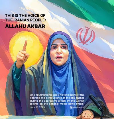 This is the voice of the Iranian people: Allahu Akbar An enduring frame and a historic scene of the courage and perseverance of the IRIB anchor during the aggressive attack by the Zionist regime on the national media news studio, June 16, 2025