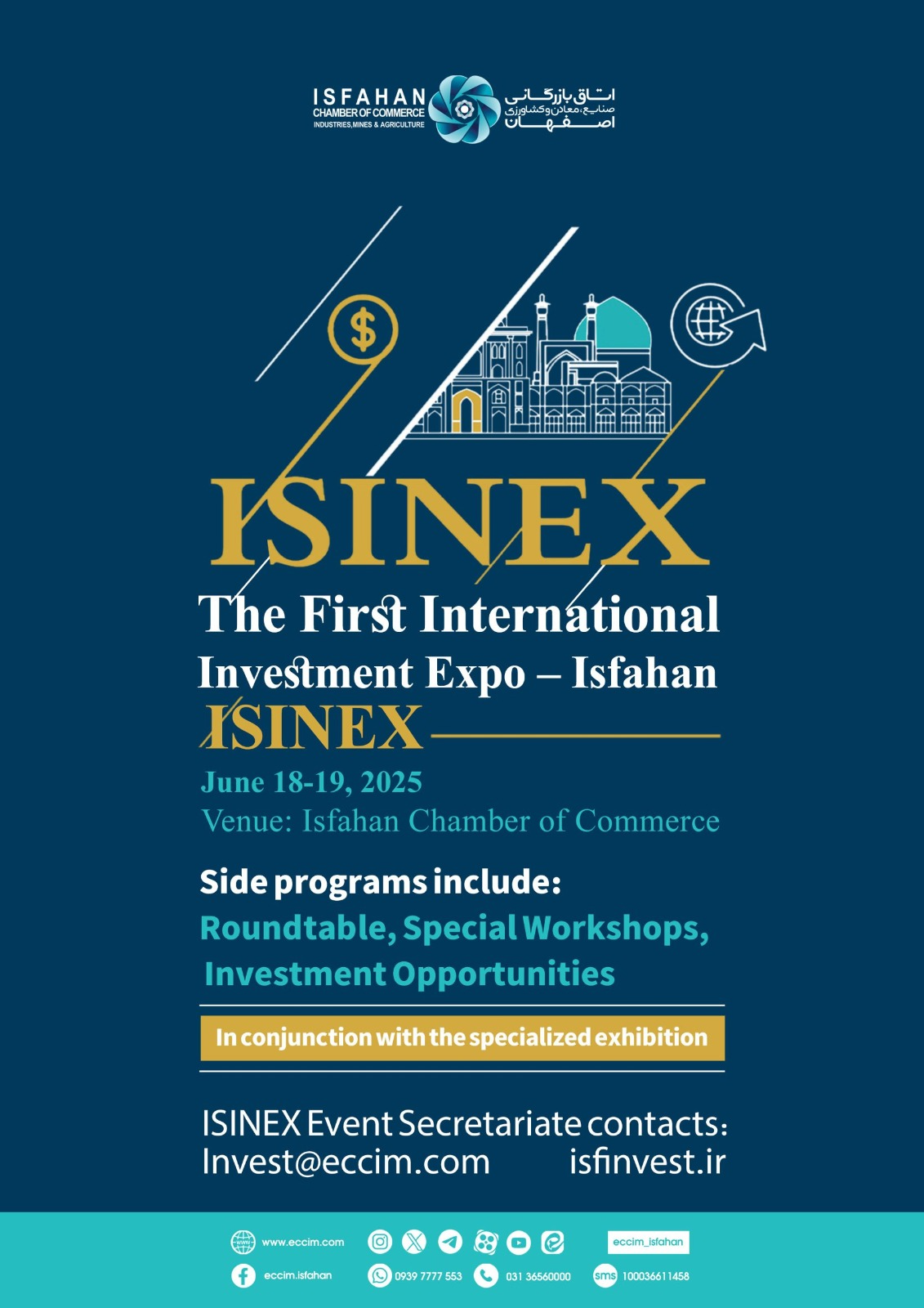 İsfahan vilayətinin investisiya imkanlarının tanıtdırılması məqsədi ilə 11-ci İsfahan Beynəlxalq İnvestisiya Sərgisi (İSİNEX) vilayətin Ticarət Palatasının təşkilatçılığı ilə 18-19 iyun 2025-ci il tarixlərdə keçiriləcəkdir.
