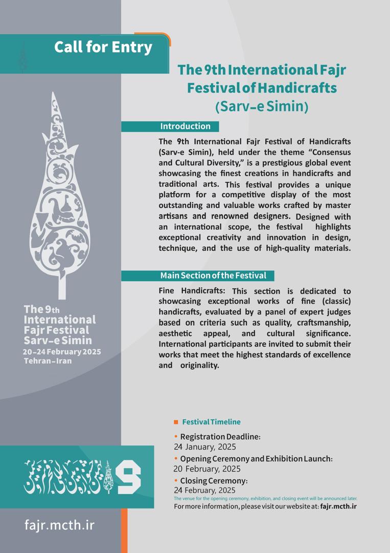بدینوسیله به اطلاع میرساند؛ نهمین نمایشگاه بینالمللی صنایع دستی و هنرهای سنتی فجر (سرو سیمین) قرار است از 2 تا 6 اسفند ماه 1403 در تهران برگزار گردد. علاقمندان به شرکت در این نمایشگاه میتوانند جهت دریافت اطلاعات تکمیلی، به پیوستهای ذیل و یا تارنمای این رویداد به نشانی؛ fajr.mtch.ir مراجعه نمایند.