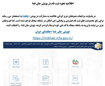 به اطلاع هموطنان عزیر ایرانی مقیم جمهوری خودمختار نخجوان و علاقمند به مشارکت در پویش #جانفدا میرساند؛ امکان پیوستن به پویش #جانفدا برای ایرانیان عزیز مقیم خارج، از طریق سامانه میخک (لینک ذیل) فراهم شده است. لذا هموطنان عزیز میتوانند با ورود به سامانه میخک با کد ملی خود ثبتنام کرده و گزینه «پویش جان فدا» را انتخاب کنند.
